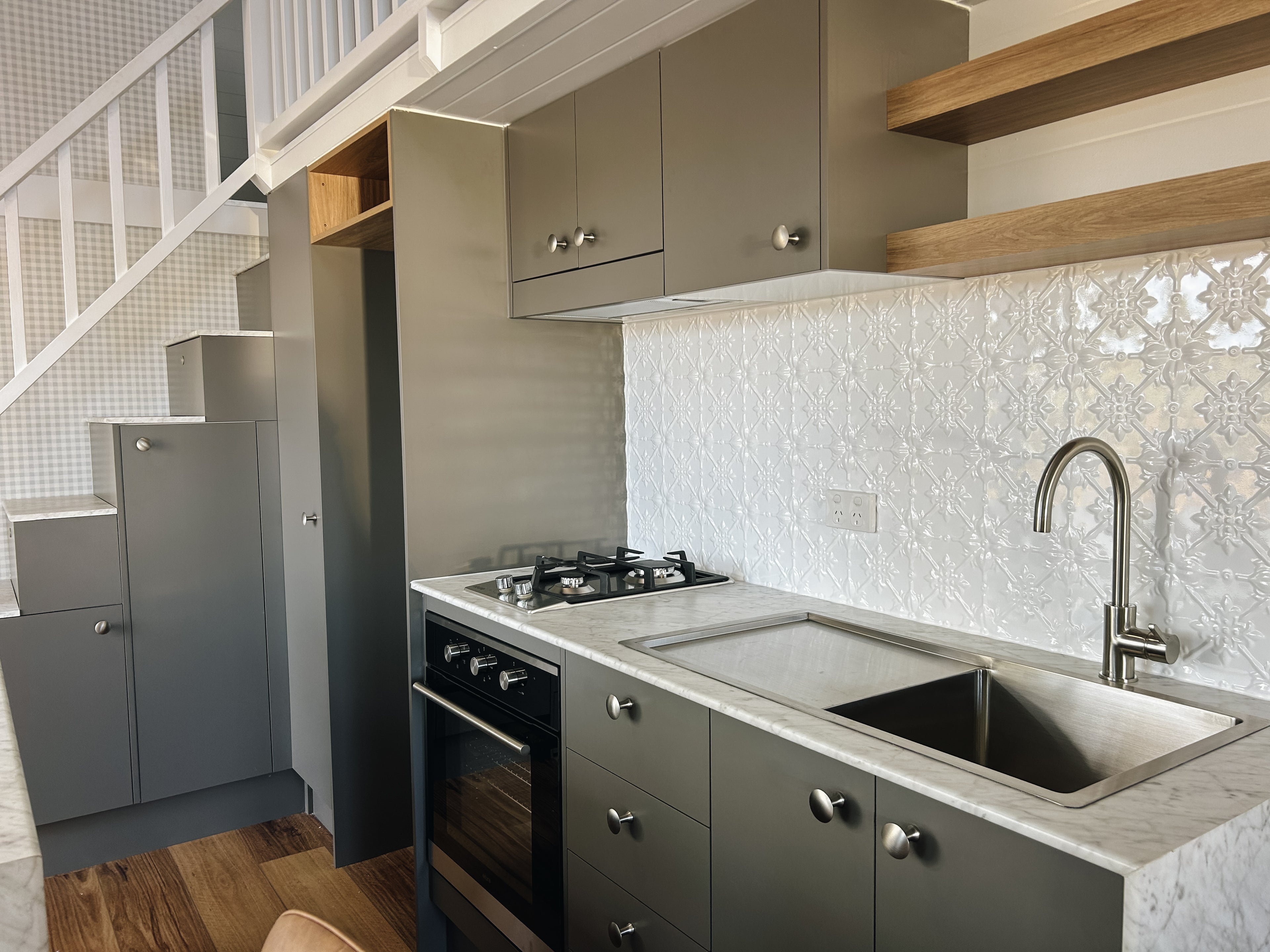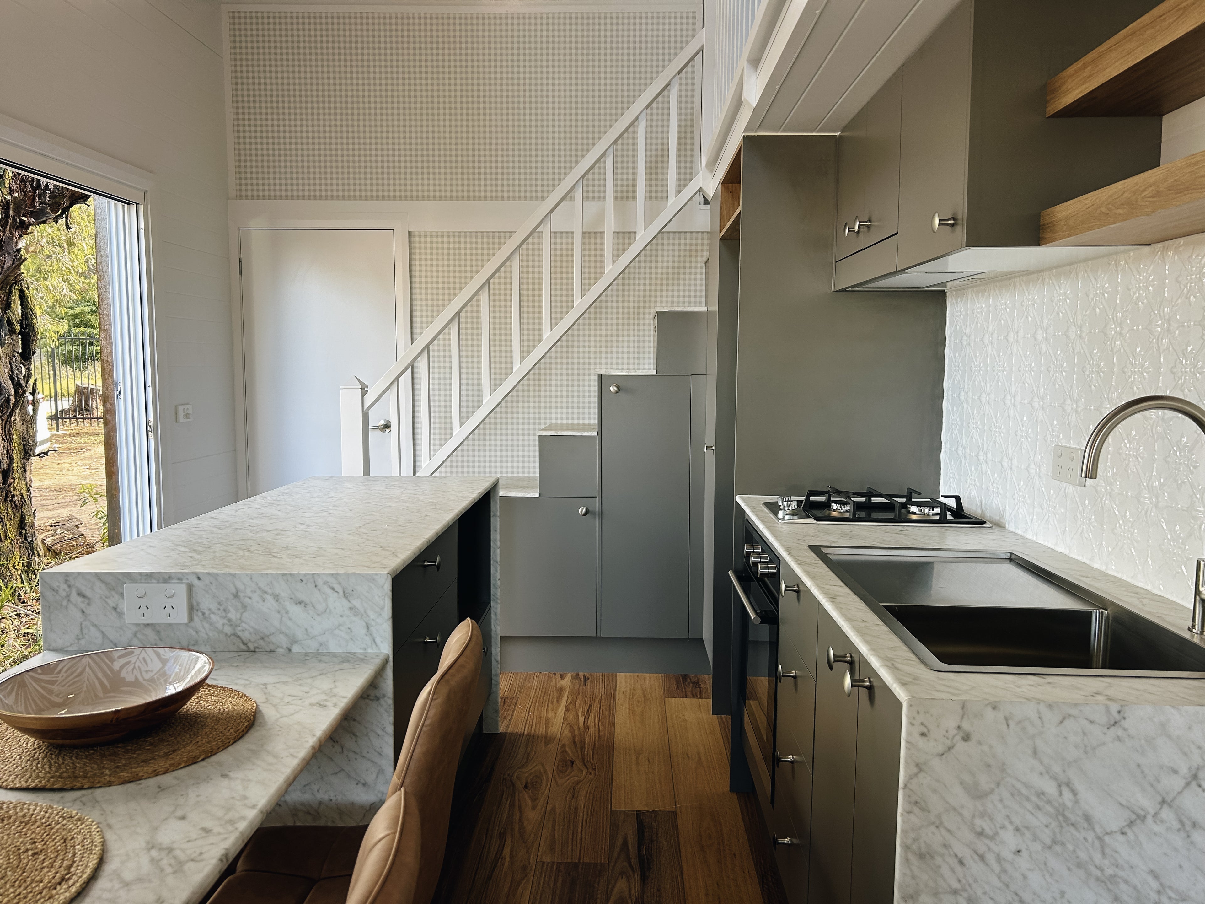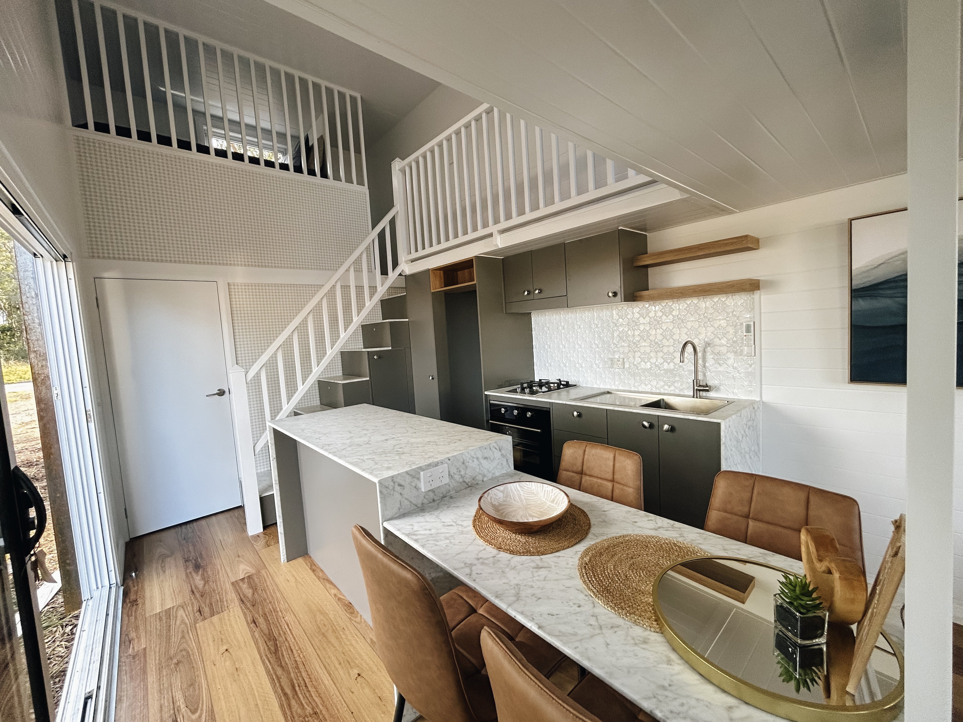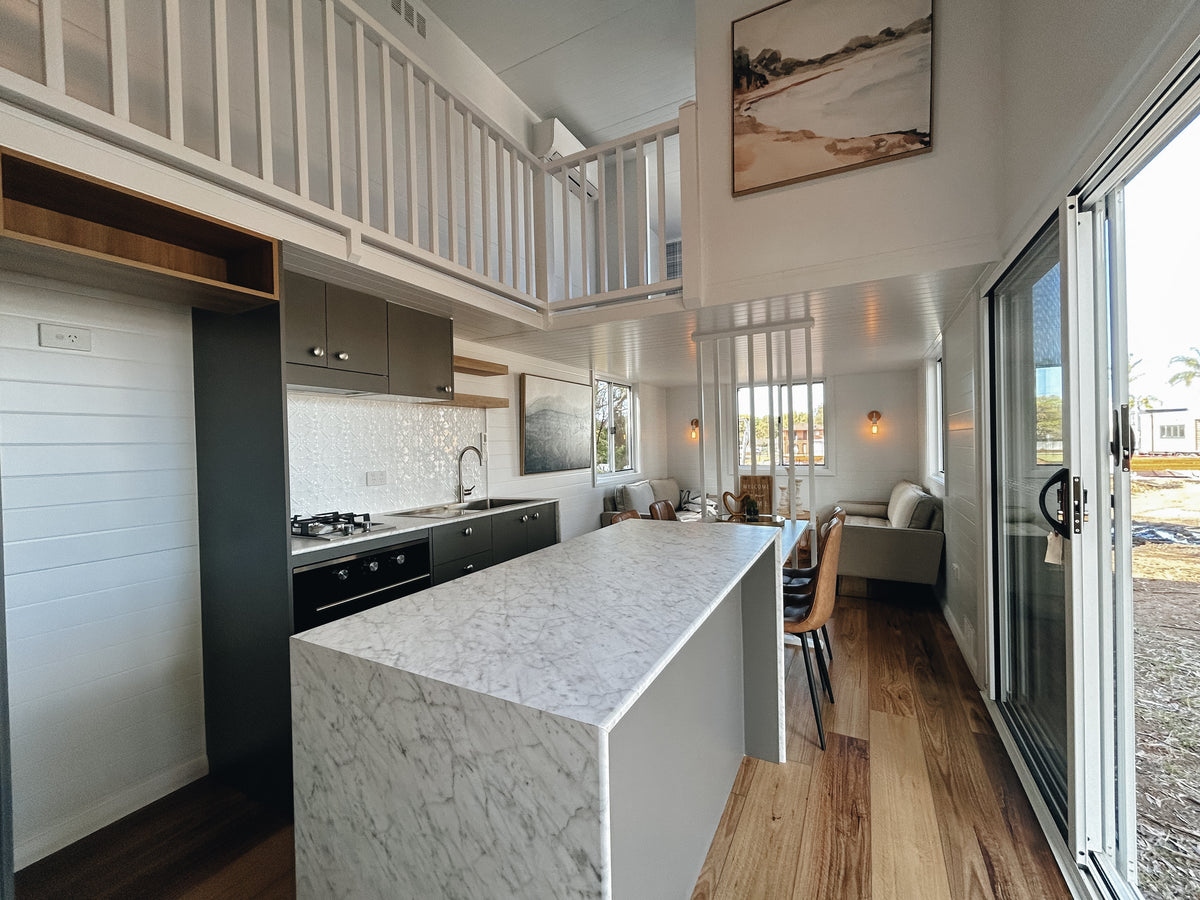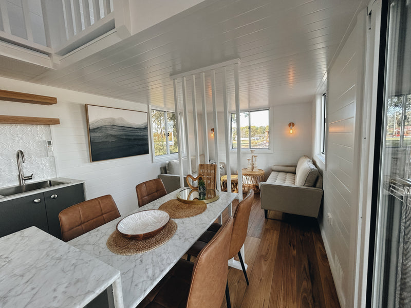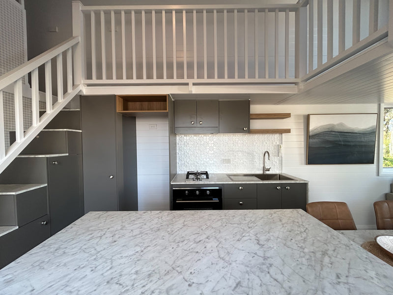 Our Dawson tiny home boasts a full kitchen with a built in dining table, island bench and breakfast bar. A spacious living area creates an open plan living vibe on the ground floor.