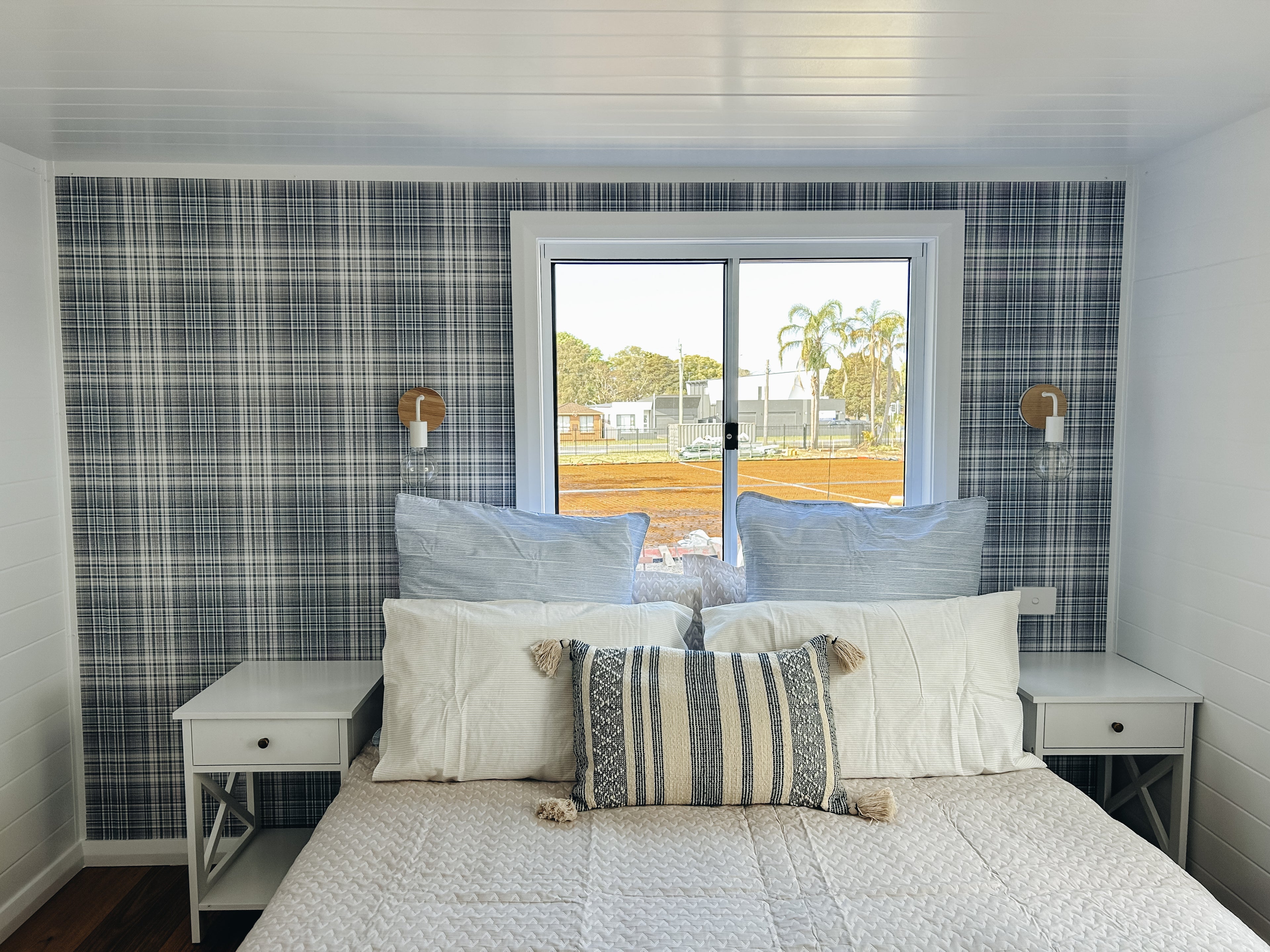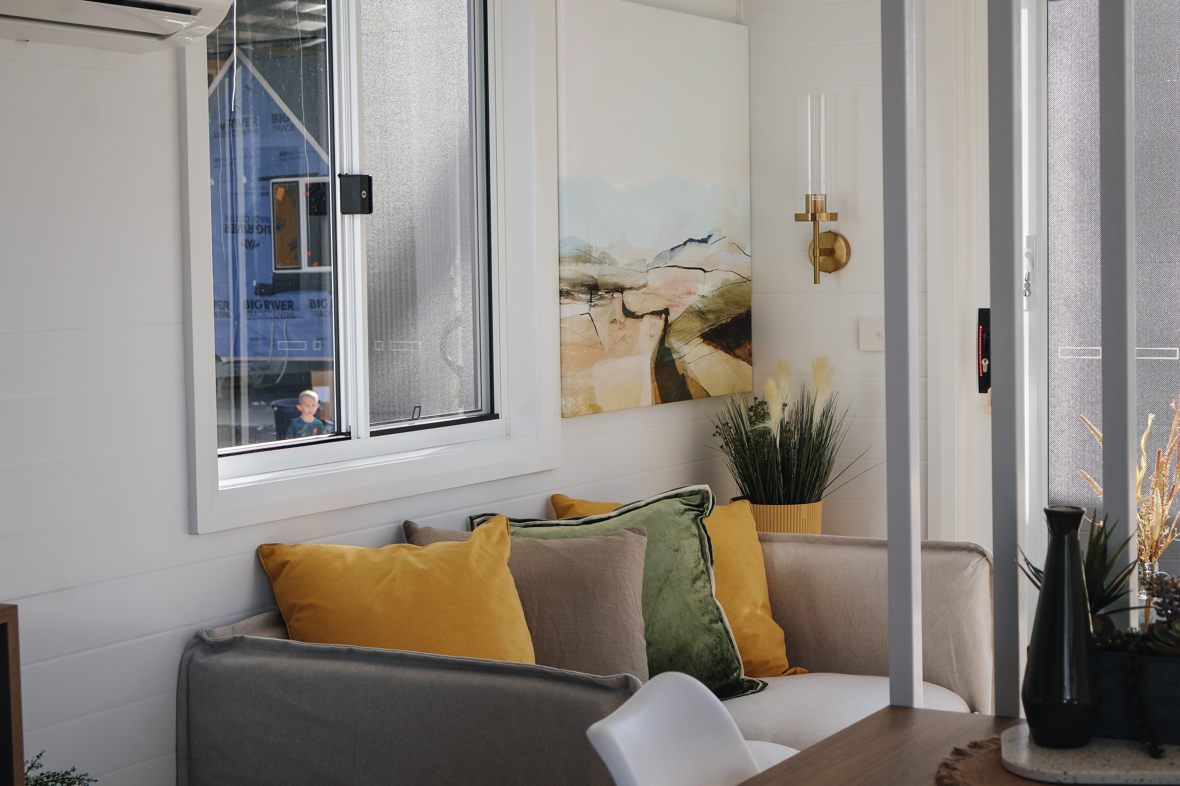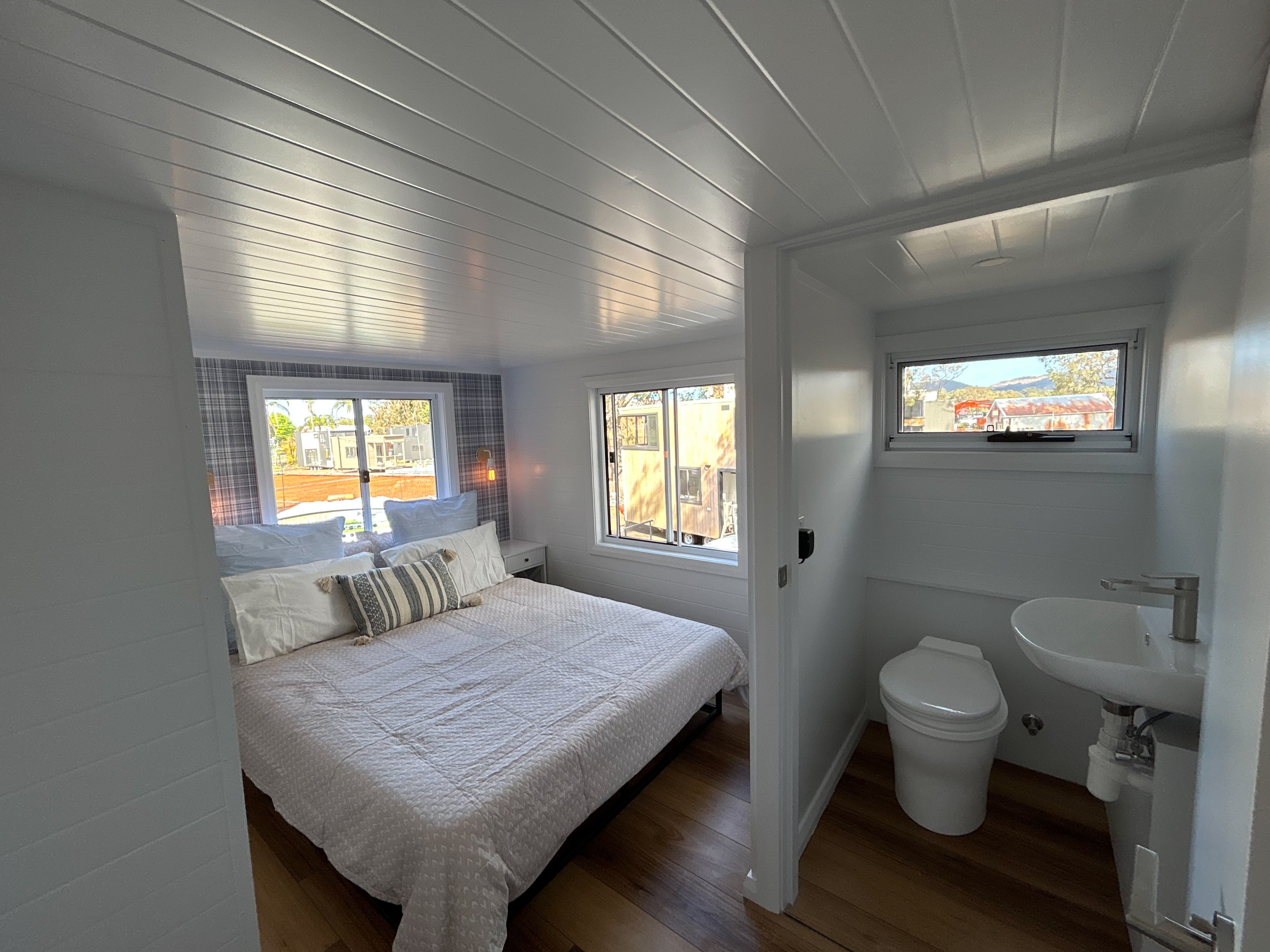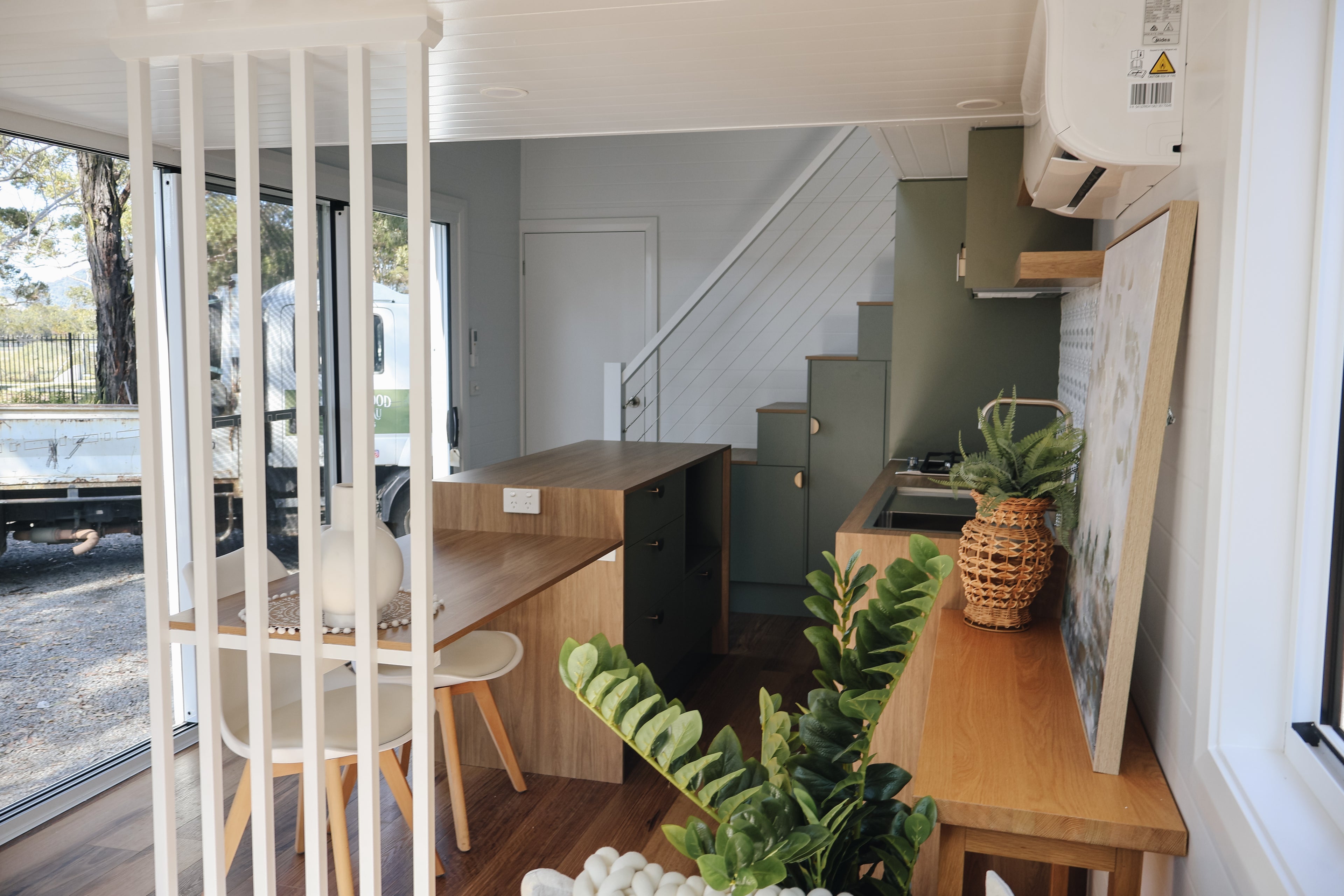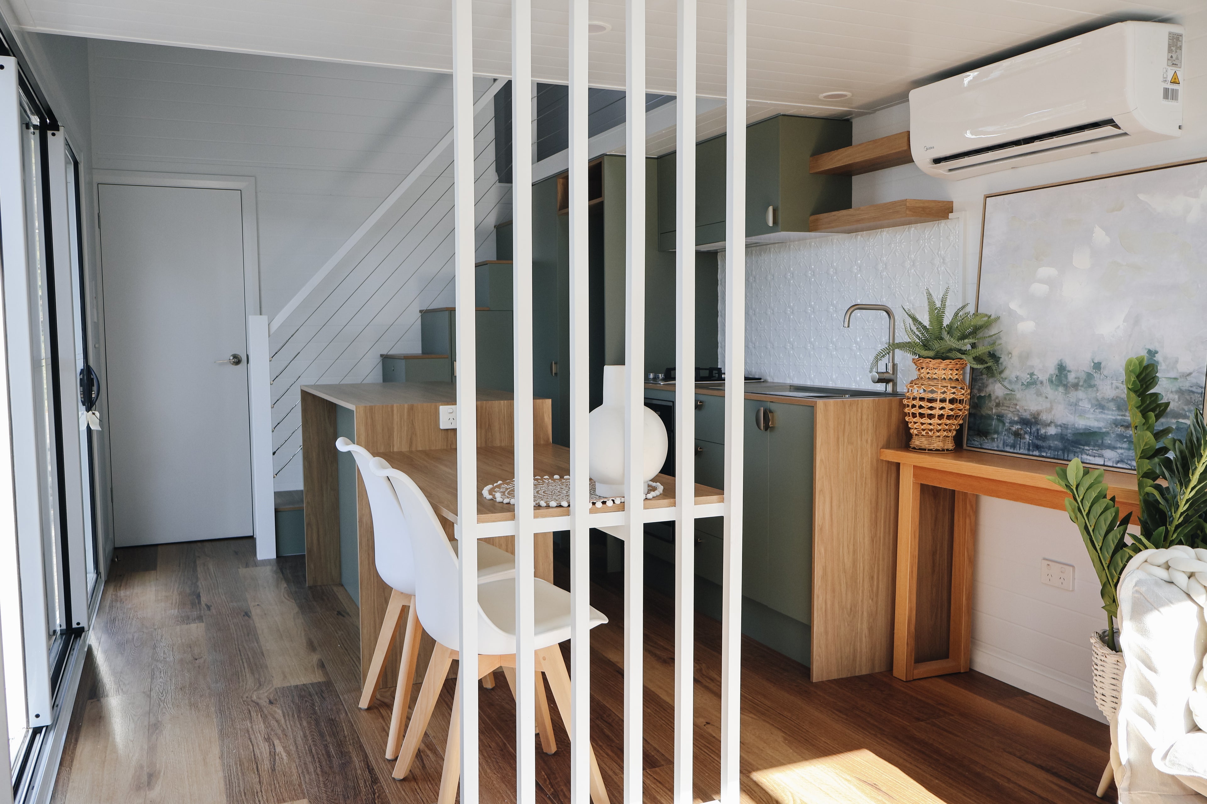 Our Dawson tiny home boasts a full kitchen with a built in dining table, island bench and breakfast bar. A spacious living area creates an open plan living vibe on the ground floor.