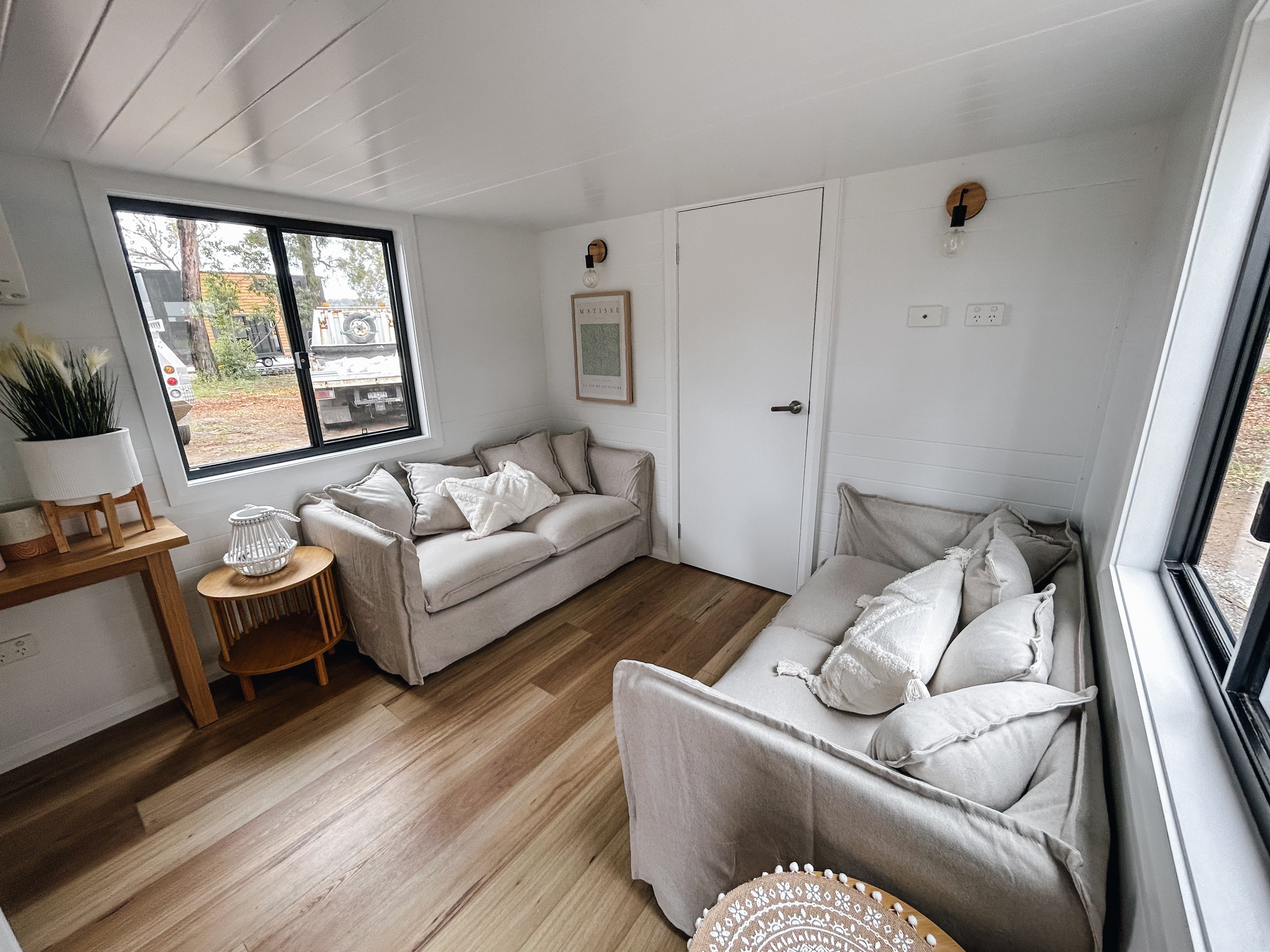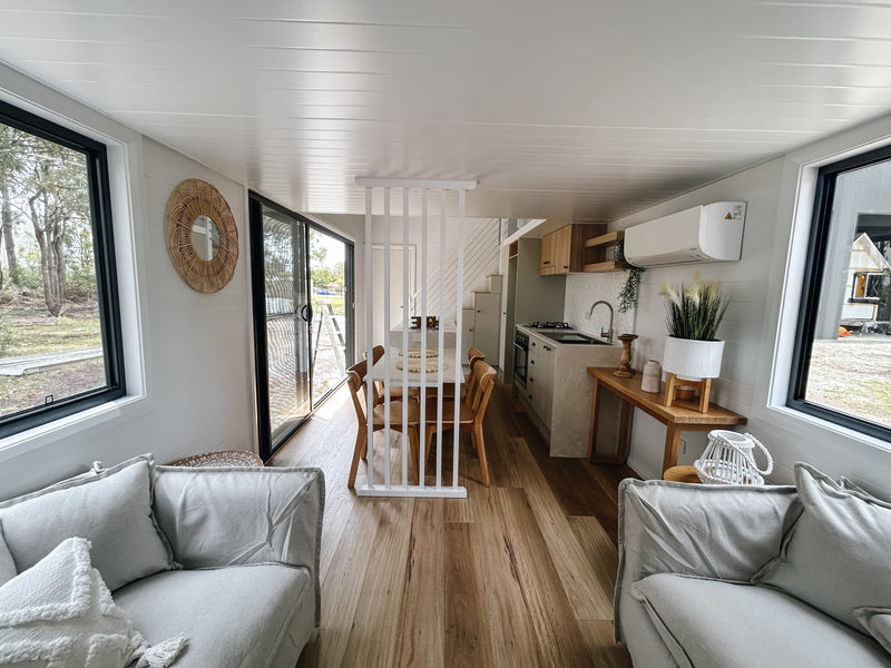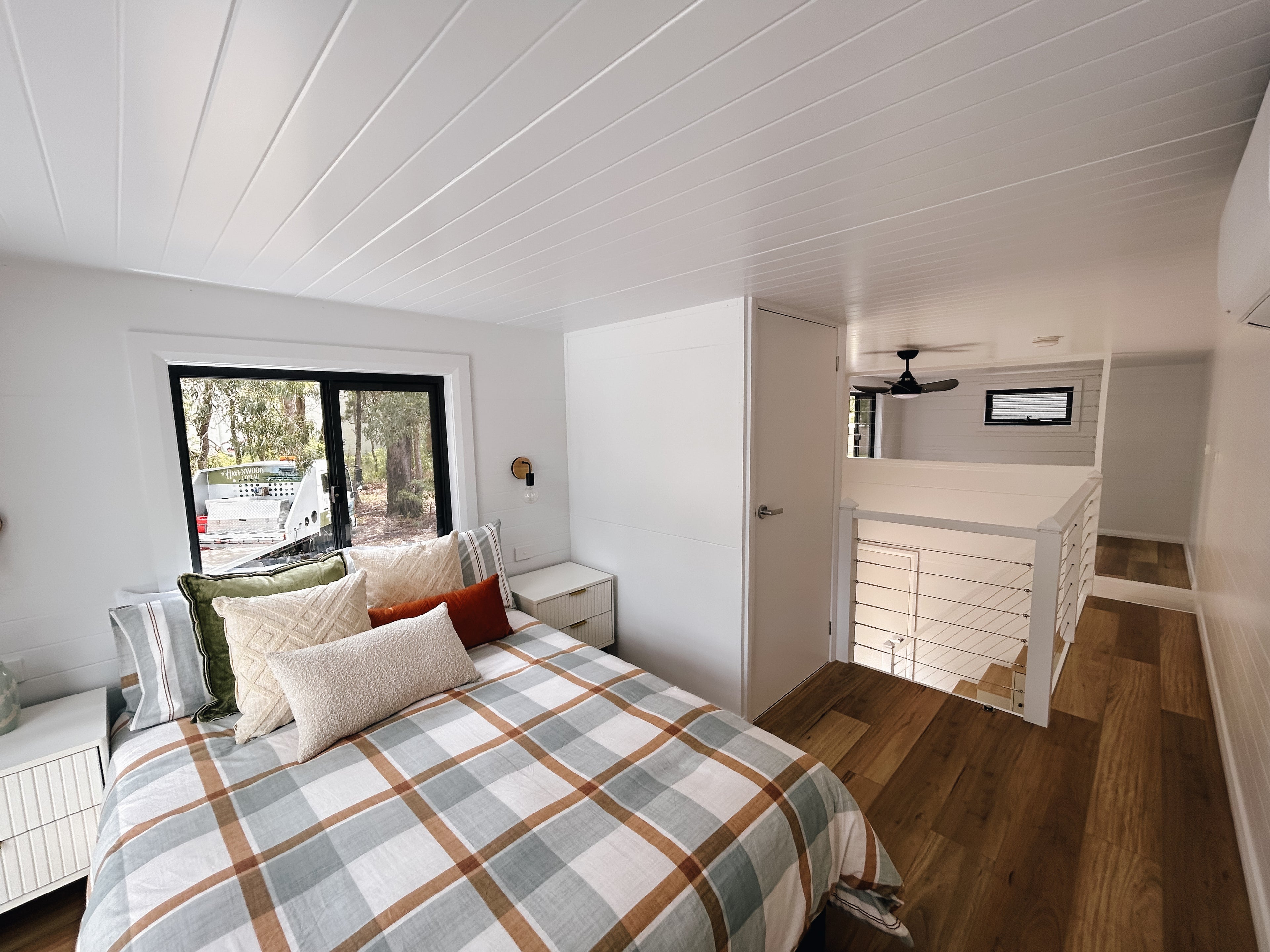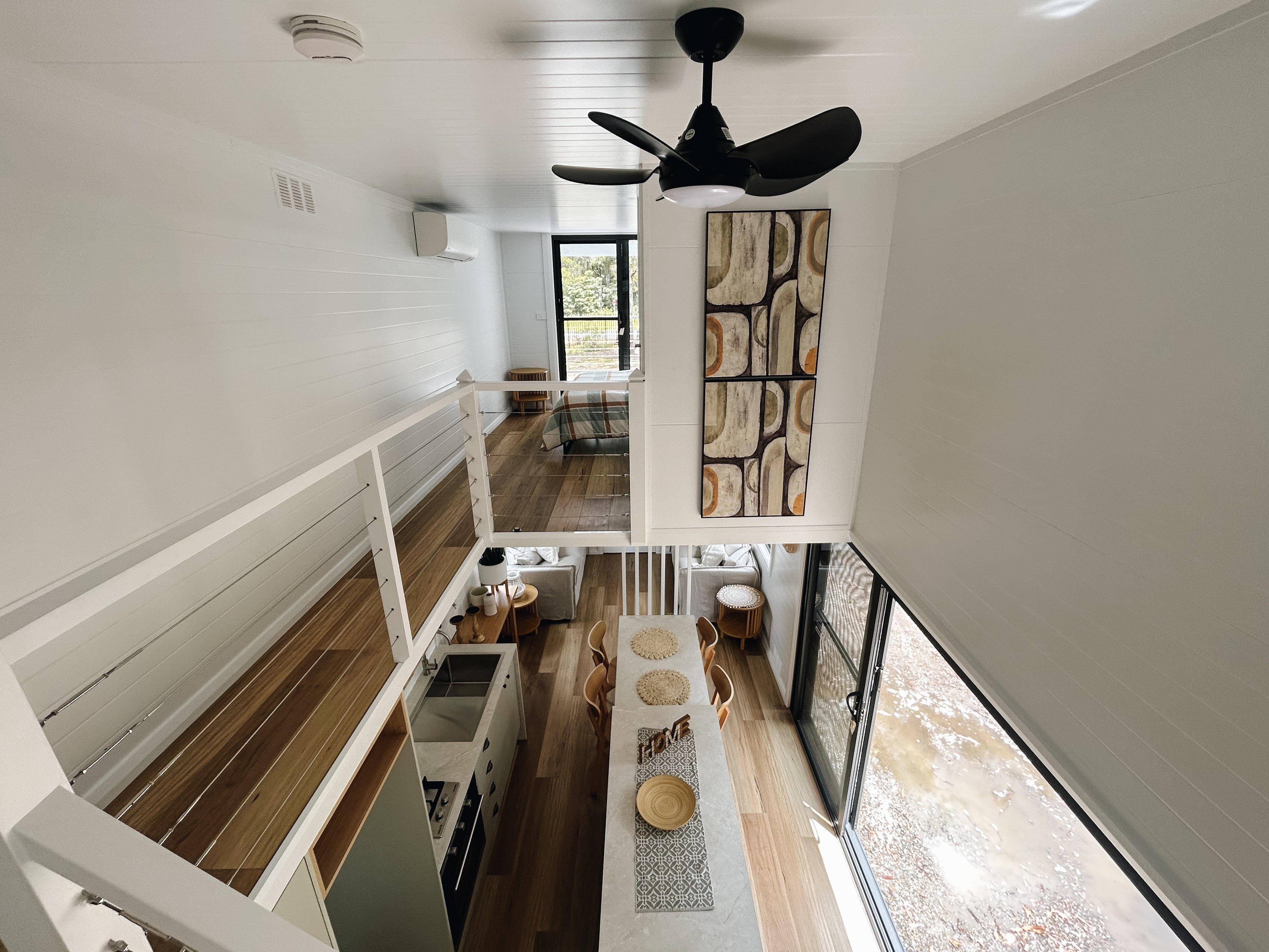 Our Storm model bridges the divide between a normal home and a tiny house on wheels. This home boasts a ground floor bedroom and two standing height lofts.
