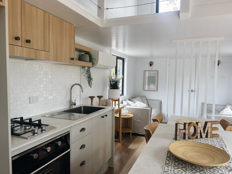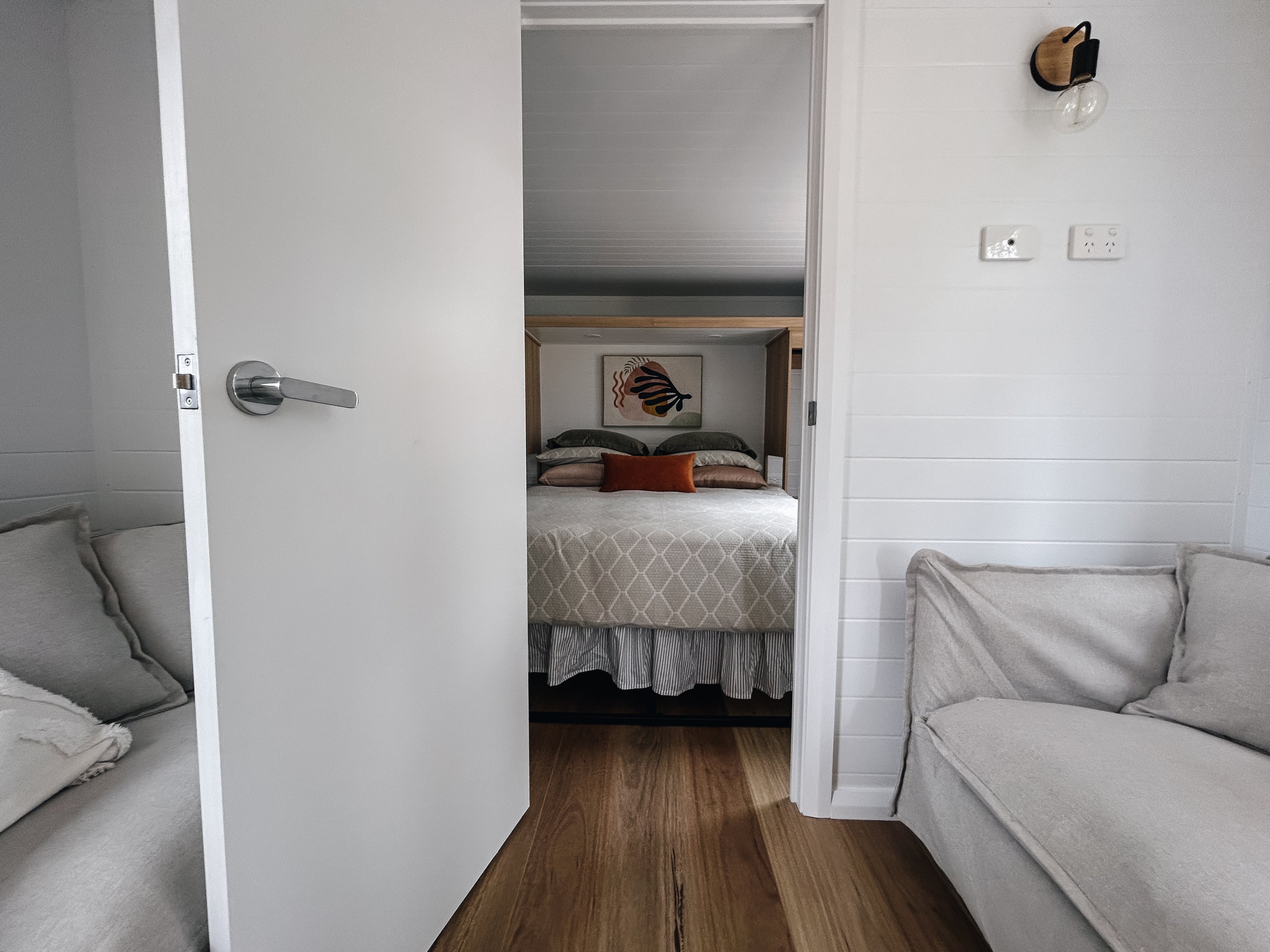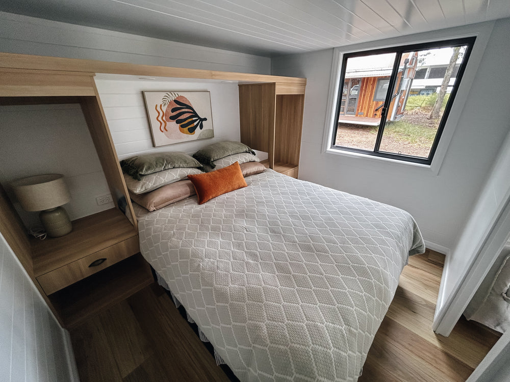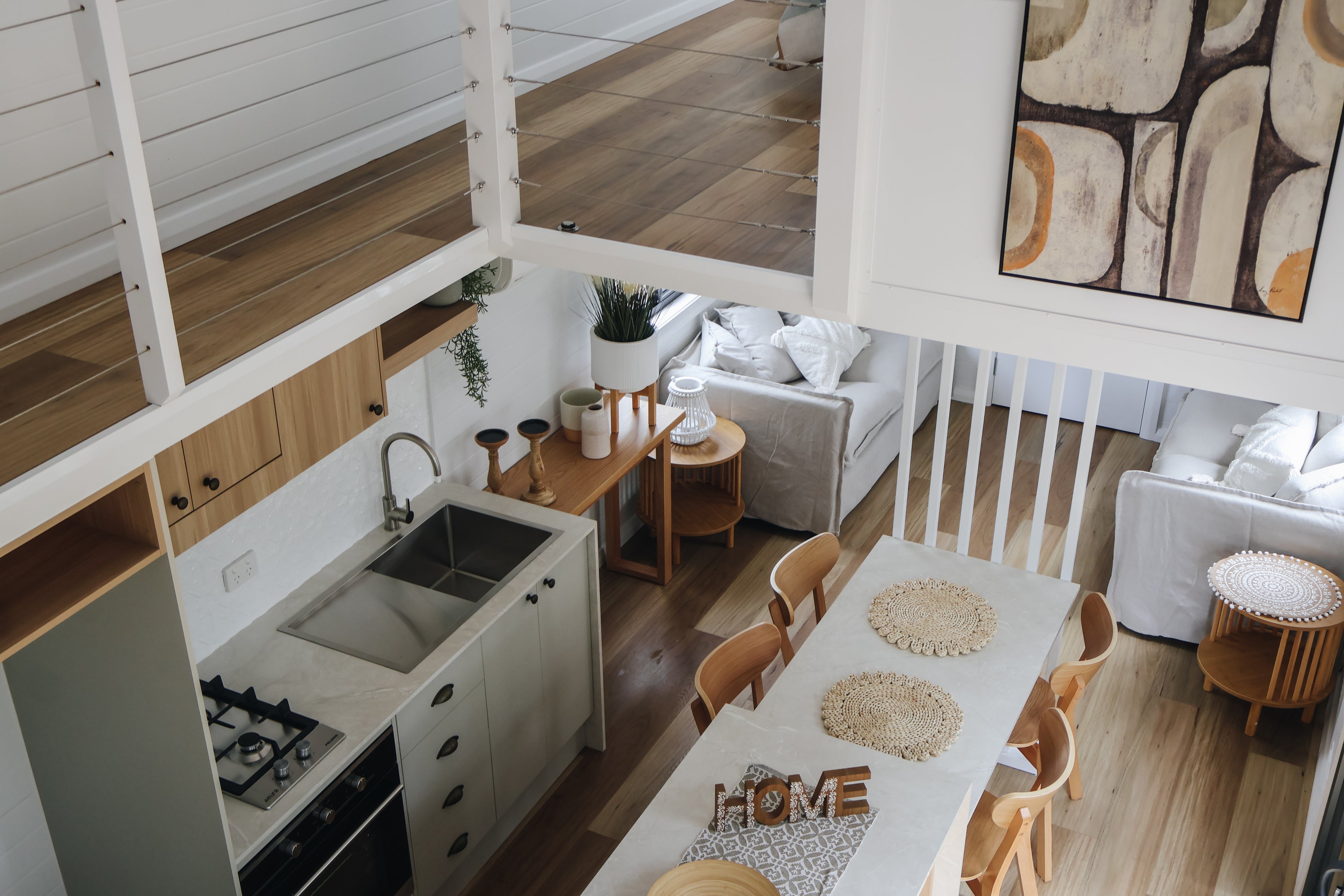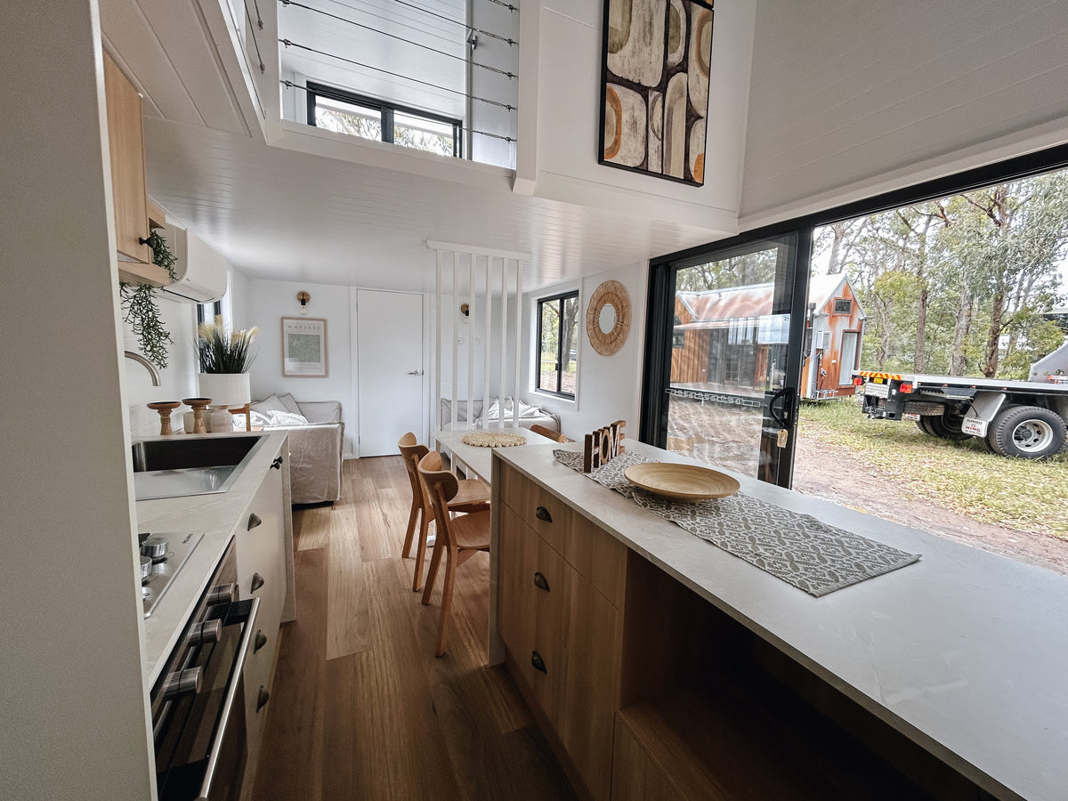 Our Storm model bridges the divide between a normal home and a tiny house on wheels. This home boasts a ground floor bedroom and two standing height lofts.